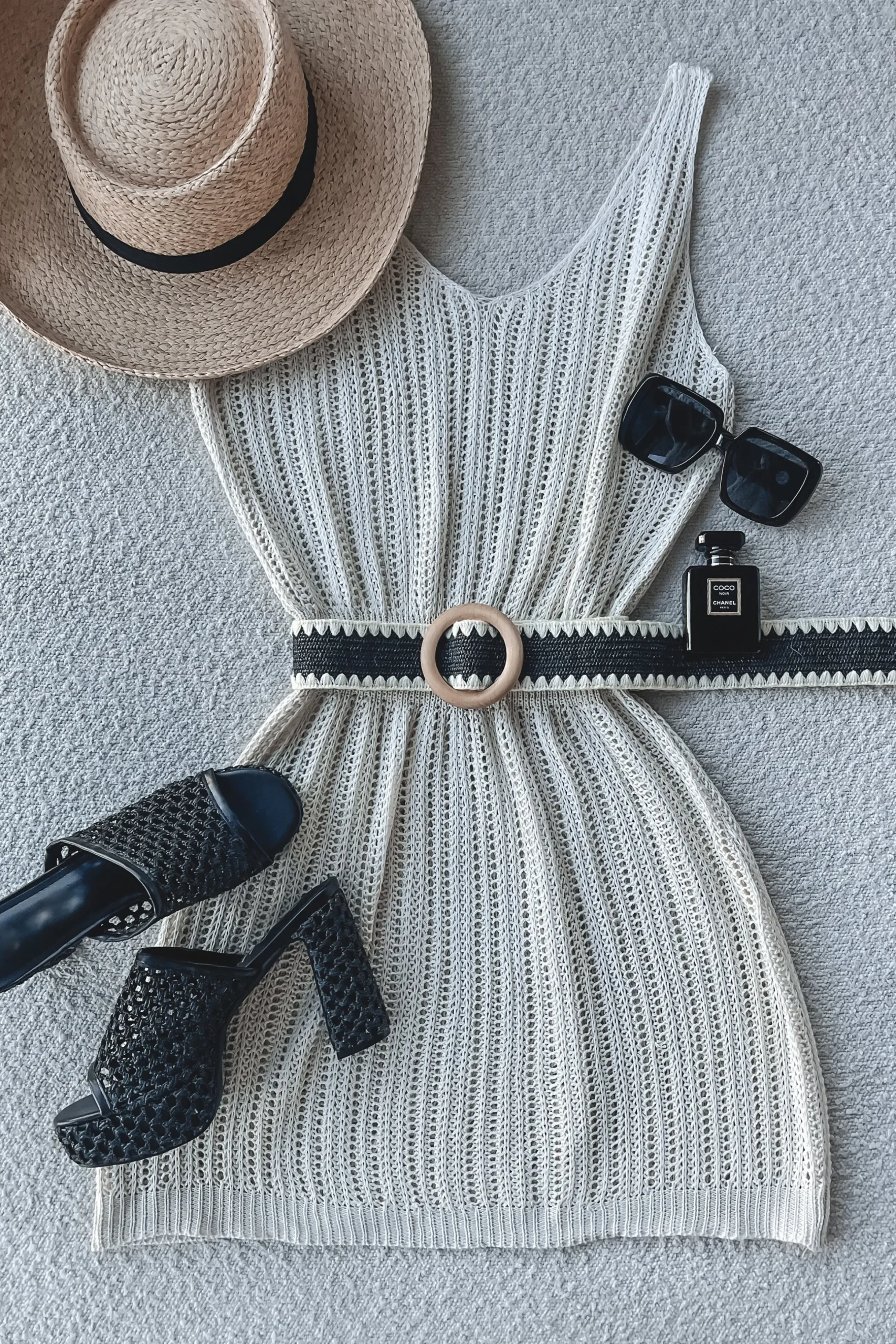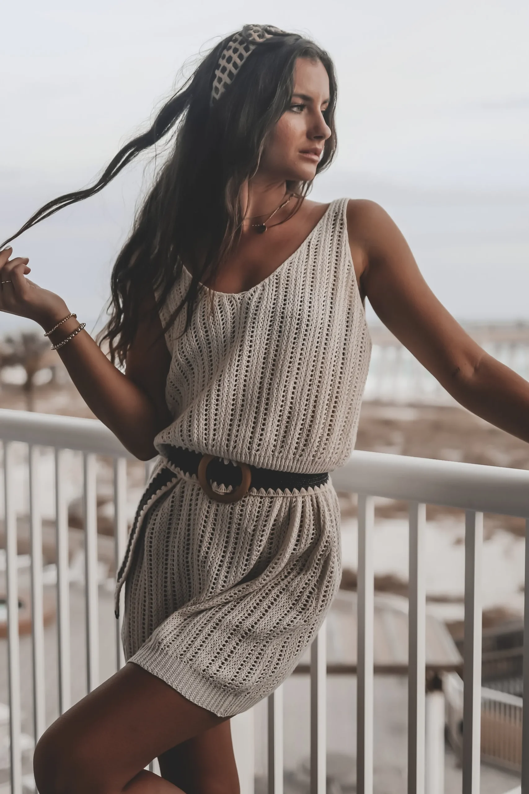 - Knit crochet mini beach cover up dress, cinched at waist, BELT NOT INCLUDED, comes in ivory and khaki