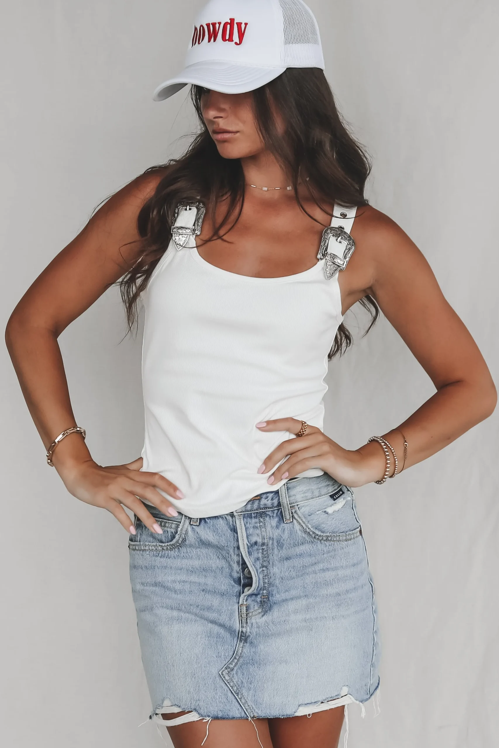 - Western ribbed knit tank with shoulder buckle detail, comes in ivory and a dark khaki